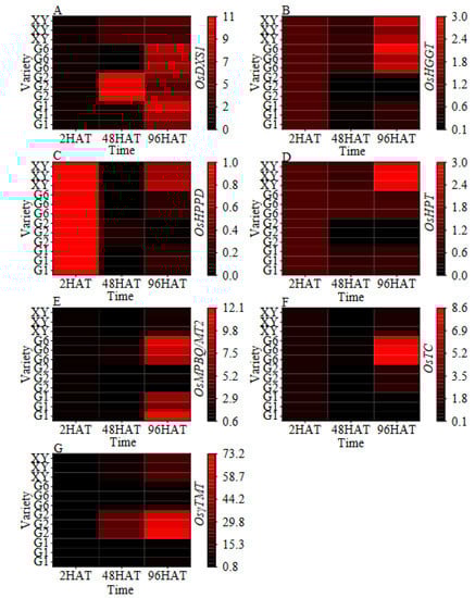 Heat map of the dynamic changes in vitamin E synthetic gene expression during germination of brown rice. (A): The OsDXS1 gene expression. (B): The OsHGGT gene expression. (C): The OsHPPD gene expression. (D): The OsHPT gene expression. (E): The OsMPBQ/MT2 gene expression. (F): The OsTC gene expression. (G): The Osγ-TMT gene expression. Treatments: 2 h after seed soaking treatment (2HAT), 48 h after seed soaking treatment (48HAT), 96 h after seed soaking treatment (96HAT). Varieties: Guanghei1 (G1), Guichao2 (G2), Guanghong6 (G6), Xiangyaxiangzhan (XY).