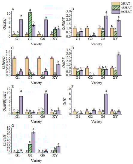 Bar chart of the dynamic changes in vitamin E synthetic gene expression during germination of brown rice. (A): The OsDXS1 gene expression. (B): The OsHGGT gene expression. (C): The OsHPPD gene expression. (D): The OsHPT gene expression. (E): The OsMPBQ/MT2 gene expression. (F): The OsTC gene expression. (G): The Osγ-TMT gene expression. Treatments: 2 h after seed soaking treatment (2HAT), 48 h after seed soaking treatment (48HAT), 96 h after seed soaking treatment (96HAT). Varieties: Guanghei1 (G1), Guichao2 (G2), Guanghong6 (G6), Xiangyaxiangzhan (XY). Bars with different letters differ significantly at p < 0.05.