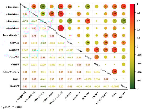 In addition, the content of α-tocotrienol had a significant positive correlation with the gene expression of HGGT and TC. The content of γ-tocopherol also had a significant positive correlation with the gene expression levels of HPPD, and significant negative correlations with the gene expression levels of DXS1, γ-TMT, and TC. Moreover, γ-tocotrienol had a significant positive correlation with TC gene expression.