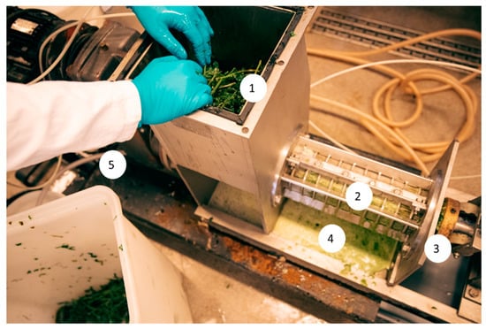 Alfalfa was harvested in spring 2019, on the island of Fyn in Denmark, manually by scythe. It was transported directly to the laboratory where it was stored at −20 °C, until it was further processed. Before pressing, the alfalfa was thawed by submerging it in cold tap water. It was then drained until it had reached the weight it had before thawing and had equilibrated to room temperature (20–22 °C). The thawed alfalfa was processed at room temperature, either through a Vincent CP-4 single-screw press (Vincent Corporation, Tampa, FL, USA) [13] (Figure 1) or an Angel Juicer S8500 twin-screw press (Angel Juicer, Seoul, South Korea) used with its standard filter. For the Vincent CP-4, the length of the cylinder and screw were 800 and 540 mm, respectively, with a diameter of 50 mm and the pitch of the screw was 50 mm. It was operated at 10 rpm with a 0.5 mm filter. The press has a maximum capacity of 68–227 kg/h. The pressure on the discharge cone was 6 bar, which was the maximum possible. During setup of the machine, lower pressures were seen to give a lower yield of green juice, but they were not systematically investigated.