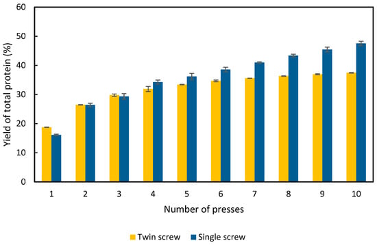 Cumulative yield of protein in the APC as a percentage of the total protein content in the raw alfalfa used in the experiment. Results are from the twin-screw and single-screw press; error bars show standard deviation, n = 3.