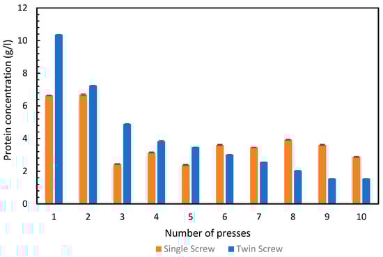 Concentration of total protein (g/L) in the green juice obtained from press 1–10 from the single- and twin-screw presses. Error bars show standard deviation, n = 3.