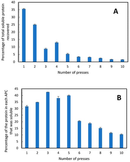 The amount of soluble protein in the APC from each press was determined and it was found that 35% of the total possible soluble protein was extracted in the first press, 25% in the second press and in the third and fourth press only 8 and 13% of the total soluble protein was extracted, respectively (Figure 4A). As speculated above, the 50% yield of protein extracted from the alfalfa was likely due to recovery of soluble and insoluble protein, given that only ca. 33% of the total protein in alfalfa is soluble. Therefore, the proportions of soluble and insoluble proteins in APC from the single-screw press were determined. In the APC from the first press, the proportion of soluble protein was close to 33%, which was further enriched to 42.5% in the APC from the third press (Figure 4B). This is consistent with the results in Table 2 where the third press resulted in the highest percentage of protein in the APC. The APC produced from each of the first five presses had a proportion of soluble protein, which was almost twice as high as that in the second five presses (Figure 4B). This indicates that when the alfalfa is pressed more than 5 times, the APC produced contains greater and greater proportions of insoluble protein. A total of 1041 g of protein was extracted in the 10 presses (from a total possible protein amount of 2189 g), from this, 314 g was soluble, which corresponds to 30.1%. Therefore, in order to generate an APC with the highest proportion of soluble protein, a maximum of five pressings should be used.
