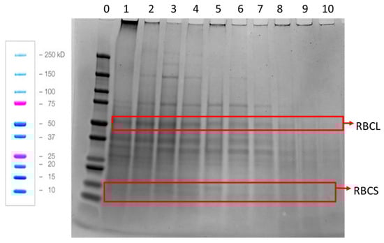 Reducing SDS-PAGE of the APC obtained from press 1–10 from the single-screw press. Lane 0, molecular weight standards. Lanes 1–10, APC from presses 1–10, respectively. RBCL = Large RuBisCO subunit, RBCS = Small RuBisCO subunit. Blue and pink colored bands are from Biorad’s instructions showing how the standards are expected to run. The same mass of APC from each pressing was used to prepare the sample loaded onto each well of the gel.