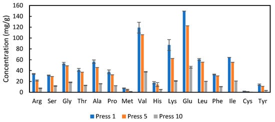 To determine whether the alfalfa protein concentrate had a suitable amino acid profile and whether that profile was changed by repetitive pressing, analysis was conducted on presses 1, 5 and 10 from the twin-screw press. The results in Figure 6 show that the amino acids present in the highest concentrations were valine, lysine, and glutamic acid. As expected from the results in Figure 2, the concentrations of each amino acid declined as more presses were conducted. However, the overall profile (percentage of each amino acid) did not change markedly (see Table A2, Appendix B).