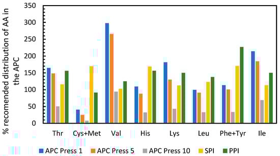 The United Nations Food and Agricultural Organization (FAO) recommends that adult humans should consume 0.8 g of protein per kilogram of body weight per day [21]. Furthermore, the protein consumed should have a specific amino acid profile [21]. The APC produced here was compared to the FAO requirements and to two other popular plant based protein isolates, namely soy protein isolate (SPI) and pea protein isolate (PPI) in order to determine if APC had a similar quality. The data from SPI, PPI and the FAO reference values were obtained from Corgneau et al., 2019 [22]. For this comparison, the amount of each amino acid recommended by the FAO to be consumed per day was normalized to 100%. The data in Figure 7 shows that consuming 0.8 g of APC from press 1 per kg of body weight would supply markedly more of 7 out of the 10 essential amino acids when compared to the FAO recommendation. In particular, approximately three times the necessary amount of valine would be obtained. Consuming 0.8 g/kg bodyweight of the APC from press 5 would supply more than enough of six of the essential amino acids, whereas the APC from press 10 had a low amount of protein (Table A3, Appendix B), which results in insufficient supply of all amino acids. When the APC from press 1 is compared to soy protein isolate and pea protein isolate, it can be seen that APC is enriched in valine and isoleucine, has similar proportions of threonine and lysine, and lower proportions of cysteine + methionine, histidine and phenylalanine + tyrosine. The results suggest that the proteins in APC obtained from the first pressings would complement the amino acid profile of soy and pea protein isolates and give a profile that is acceptable for human consumption.