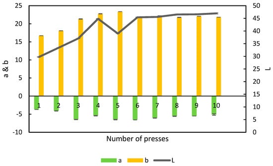 L-a-b is the analysis of the color spectrum of a sample in three dimensions. “L” is light from 0 (dark) to 100 (white), “a” is from −100 (green) to 100 (red) and “b” is from −100 (blue) to 100 (yellow) [23]. When the color of the APC was measured, it was seen that the amount of green color increased from press 1–3 (Figure 8). This suggests an increase in extraction of the green chlorophyll to the APC. The leaf of the alfalfa has the highest concentration of protein and the highest concentration of chlorophyll in the plant [5,19]. This corresponds well with the amount of protein extracted presented in Table 2.