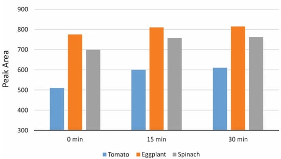 Effect of ultrasonication time on the extraction of histamine from three representative pooled matrices (tomato-, eggplant- and spinach-based). For experimental conditions please see Section 2.4 and Section 3.2.