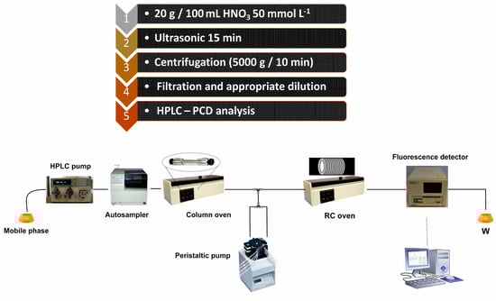 Sample processing/preparation was based on ultrasonic-assisted extraction in HNO3. In brief, accurately weighed amounts of each sample (ca. 20 g) were thoroughly mixed with 100 mL of HNO3 (50 mmol L−1) using a laboratory blender. The resulting mixture was extracted following ultrasonication for 15 min. Subsequent simple steps included centrifugation, filtration through syringe filters and HPLC-PCD analysis (either directly or after dilution with mobile phase when necessary).