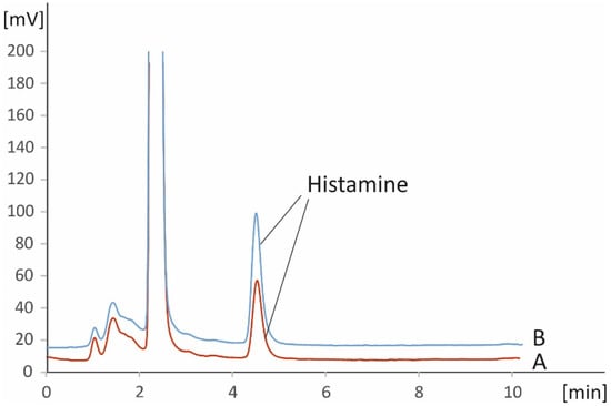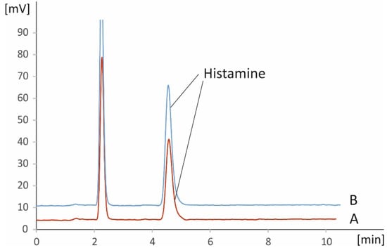 Since the final step prior to HPLC injection involves filtration through PTFE syringe filters (polytetrafluoroethylene), it was necessary to confirm the absence of binding of the analyte on the membrane material [21]. A series of experiments using low-medium-high concentrations of aqueous standards of histamine confirmed the suitability of the selected filters for the extraction of the polar analytes with percent recoveries being in the range of 97–101%.
