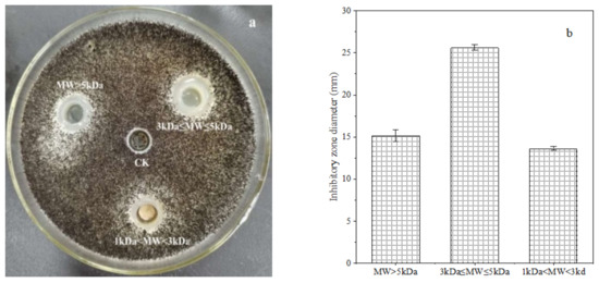 Inhibition effect of polypeptides (at a concentration of 0.5 mg/L) with different molecular weight (0.5 mg/L) produced by B. brevis DTM05 on A. carbonarius H9 (a). The inhibition zone diameter of polypeptides with different molecular weight on A. carbonarius H9 (b).