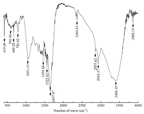The FT-IR spectra of the crude polypeptides with molecular weight between 3 and 5 kDa were dominated by the peaks at different wavelengths of 3908.35, 3406.39, 2918.37, 2855.62, 2364.81, 1657.87, 1542.62, 1459.88, 1051.33, 783.62, 699.28, 501.66 and 419.69 cm−1 (shown in Figure 2). According to the work of Long et al. [33] and Liu et al. [34], the absorption of β-sheet and α-helix were in the frequency area of 1610–1640 and 1650–1660, respectively; thus, bands around 1657.87 were expected for the crude polypeptides with α-helical and β–sheet structures, which is conducive to maintaining the secondary structure stability of polypeptides [35]. Absorbance at 3406.39 cm−1 wavenumbers was due to the stretching vibrations of the O–H group, indicating the presence of hydrogen bonds (intramolecular and intermolecular) in the polypeptide molecules [34]. Absorbance at 2918.37, 2855.62 and 2364.81 wavenumbers may be due to –CH2 asymmetric and symmetric stretching vibrations of lipid in crude polypeptides [34]. The rest of the peaks at 1522.62, 1459.88, 1051.33, 783.62, 699.28, 501.66 and 419.69 cm−1 were caused by CH2 scissoring, CH3 bending, and C–O stretching vibration, respectively [36,37,38,39]. Therefore, it can be speculated that the crude peptide was a mixture of mainly polypeptides and small amounts of lipids and other carbohydrates.