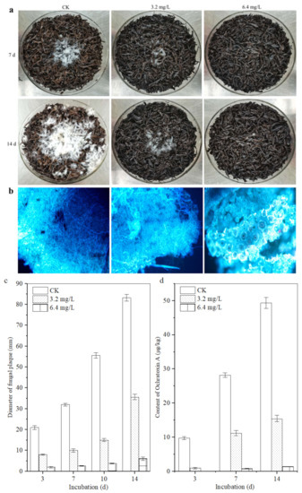 The fluorescence micrograph of the tea leaves inoculated with A. carbonarius H9 is shown in Figure 5b. After 14 d of incubation, as for the control group, a large amount of mycelium of A. carbonarius H9 grew inside and outside the leaf tissue. Although a large number of hyphae of A. carbonarius H9 grew on the surface of tea leaves treated with 3.2 mg/L polypeptide, only a small amount of mycelium penetrated into the internal tissue of the tea leaves. For tea leaves treated with 6.4 mg/L polypeptide, fungal mycelium could hardly be seen, either on the leaf surface or inside leaf tissues. The results of the fluorescence microscopy showed that polypeptide (with a concentration of 3.2, 6.4 mg/L in the tea matrix) had significant inhibitory effects on the growth of A. carbonarius H9 on the tea matrix, and the inhibitory effect of 6.4 mg/L polypeptide was greater than that of 3.2 mg/L.