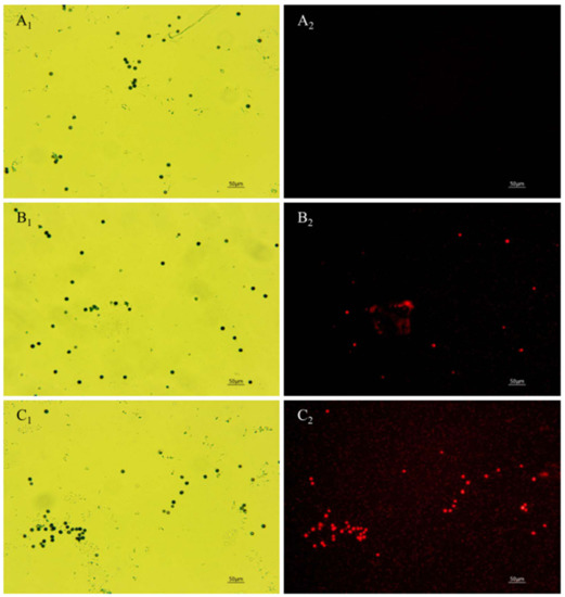 Effect of anti-fungal peptides treatment on membrane permeability of A. carbonarius H9 spores. (A1,A2) control group under bright field and fluorescent field; (B1,C1) spore membrane treated by 1.6 and 6.4 mg/L polypeptides under bright fields; (B2,C2) spore membrane treated by 1.6 and 6.4 mg/L polypeptides under fluorescent fields.