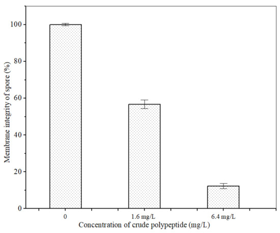 The PI fluorescent stain can pass through the damaged cell membrane into the cells and combine with the nucleic acid material to emit red fluorescence when the cell membrane of A. carbonarius H9 spores is damaged [42]. No cell-emitted red fluorescence was observed in the control spore cells without polypeptides treatment, but a certain number of cells were observed to emit red fluorescence in spore cells treated by polypeptides with concentrations of 1.6, 6.4 mg/L, as shown in Figure 6. The integrity of the spore cell membrane of A. carbonarius H9 without polypeptide treatment was maintained at 100% (control group), while the membrane integrity of spore cells treated with 1.6 and 6.4 mg/L was significantly reduced. The higher the concentration of polypeptides, the more severe the disruption to the cell membrane integrity of A. carbonarius H9. When the polypeptide concentration of treated A. carbonarius H9 spores was 6.4 mg/L, the integrity of the cell membrane was only 12.29% (as shown in Figure 7). It is generally believed that the inhibition of polypeptide on the fungal spore survival rate is mainly manifested through the destruction of spore cell membranes (Qian et al., 2015; Cai et al., 2020). The polypeptides with antifungal effects such as Bacillomycin D (a polypeptide derived from B. subtilis) [42], PAF26 [15], etc., were found to have significant inhibitory and destructive effects on fungal spore cell membranes. It is possible that antifungal peptides may destroy the spore cell membrane, leading to the leakage of nucleic acids and proteins, and to the production of reactive oxygen species that cause apoptosis of spore cells, which eventually inhibits germination and the survival rate of fungal spore [26,29].