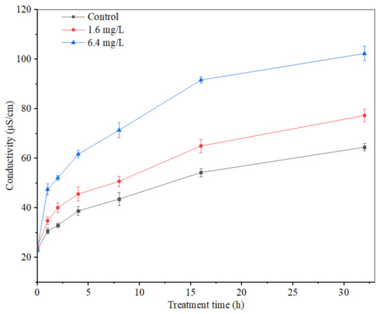 The mycelium extracellular conductivity of A. carbonarius H9 treated by polypeptides with different concentrations was analyzed, as shown in Figure 9. The extracellular conductivity of A. carbonarius H9 mycelia in both control and treatment groups increased gradually with the prolongation of the treatment time. The mycelium extracellular conductivity of A. carbonarius H9 treated by polypeptides was higher than that of the control group and the conductivity of the highest concentration (6.4 mg/L) treatment was significantly higher than that of the lowest concentration (1.6 mg/L).