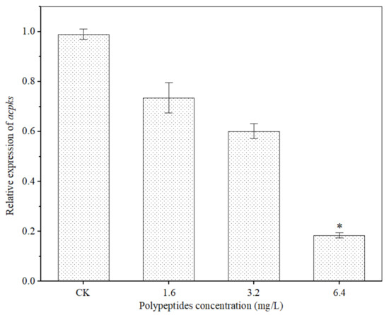 OTA biosynthesis is mainly regulated by the polyketide synthase gene (acpks and acOTApks), non-ribosomal peptide synthase gene family (acOTAnrps) and other regulators (laeA and veA) [31,43,44,45]. In order to further clarify the inhibition effects of polypeptides from B. brevis DTM05 on A. carbonarius H9, the effects of polypeptides on the expression of OTA polyketide synthase gene acpks in A. carbonarius H9 were investigated. The results showed that the polypeptides significantly attenuated the polyketide synthase gene acpks expression levels (Figure 10). The higher the concentration of polypeptides, the more the expression levels of the polyketide synthase gene acpks were down-regulated. When the concentration of polypeptides was 6.4 mg/L, the relative expression level of acpks was down-regulated by 81.6% (p < 0.01). The inhibition mechanism of polypeptides from B. brevis DTM05 in the OTA synthesis of A. carbonarius H9 may be similar to that of Bacillomycin D produced by B. subtilis [43] as both of them reduce OTA synthetase activity by down-regulating the expression level of the polyketide synthase gene acpks, thus eventually reducing OTA production.
