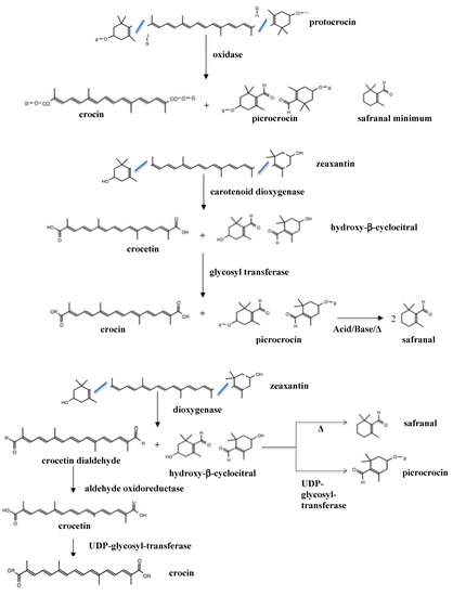There are various hypotheses on the method of obtaining these important apocarotenoids from saffron. The first theory focuses on synthesizing these compounds in the plant from protocrocin (glycosyl derivative of zeaxanthin), the substrate of an oxidative enzyme that produces a molecule of crocin and two molecules of picrocrocin. Regarding safranal, it has been described that only a minimal concentration is detected in the fresh spice [79]. Fallahi et al. [80] described another pathway wherein apocarotenoids, which are commercially important, are obtained by the cleavage of carotenoids (zeaxanthin and β-carotene) by the carotenoid dioxygenase enzyme, giving rise to crocetin and hydroxy-β-cyclocitral as products. Later, they propose a glycosylation (glycosyltransferases) step, which produces crocins and picrocrocin, respectively. Finally, they describe that picrocrocin is hydrolyzed to form safranal. This hypothesis is consistent with that described by Sereshti et al. [81], who also describe other, more specific enzymes and substrates, as seen in Figure 1.
