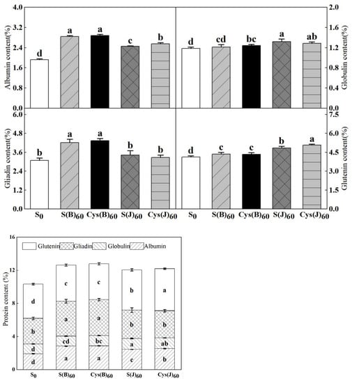 Effects of cysteine and inorganic sulfur at different stages on contents of protein and its components in flour. Different small letters in the same column of each treatment are significantly different at a 0.05 probability level.