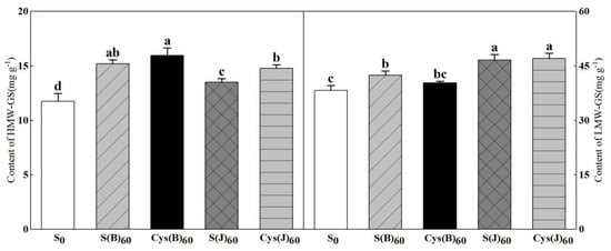 Both HMW-GS and LMW-GS were increased by cysteine or sulfur fertilizer (Figure 2). Basal fertilizer performed better in increasing HMW-GS content than the jointing stage application did. S(B) and Cys(B) increased the HMW-GS content by 29.7% and 34.7%, respectively. In contrast, fertilizer treatment at the jointing stage had a greater effect on boosting LMW-GS concentration. S(J) and Cys(J) increased the LMW-GS content by 21.7% and 22.7%, respectively. In addition, cysteine fertilizer showed better effects in increasing the contents of HMW-GS compared with sulfur fertilizer in two stages, but the increasing effect on the contents of LMW-GS was inconsistent.