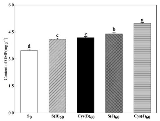 Effects of cysteine and inorganic sulfur at different stages on the contents of GMP in flour. Different small letters in the same column of each treatment are significantly different at a 0.05 probability level.