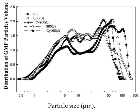 Effects of cysteine and inorganic sulfur application at different stages on distribution of GMP particles volume.