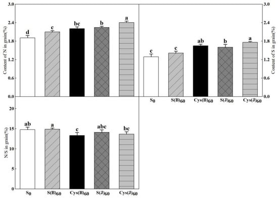 The sulfur and cysteine application significantly increased grain nitrogen and sulfur content (Figure 5). The effects of fertilization application at jointing stage were better than those of application as basal fertilization. Among different types of fertilizer treatments, Cys(J) treatment had the largest effect on increasing the content of nitrogen and sulfur in grains, which increased 26.3% and 36.4%, respectively. The variation trend of N/S ratio reflected the changes in nitrogen and sulfur content in grains to a certain extent. Among fertilization treatments at different stages, the effect of fertilizer application at the jointing stage was better than that of basal application. Among different sulfur fertilizer treatments, Cys(J) treatment had the most significant effect, and the N/S ratio decreased by 7.5%.