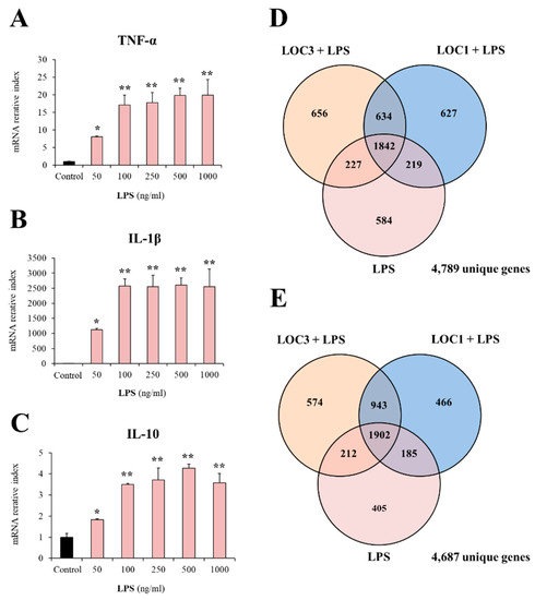 Effect of Lactiplantibacillus plantarum strains isolated from fresh tea leaves in murine RAW macrophages stimulated with the Toll-like receptor 4 (TLR4) agonist lipopolysaccharide (LPS). The expression of the immune factors TNF-α (A), IL-β (B) and IL-10 (C) was determined 3 h after different doses of LPS stimulation. Asterisks indicate significant differences between the indicated groups and control macrophages, (*) p < 0.05, (**) p < 0.01. Macrophages were treated with L. plantarum LOC1 or LOC3 strains and then challenged with LPS. The expression of genes was determined by microarray analysis 3 h after LPS stimulation. Non-lactobacilli-treated macrophages stimulated with LPS were used as control. Venn diagrams showing the number of differentially up-regulated (D) and down-regulated (E) genes for each experimental group.