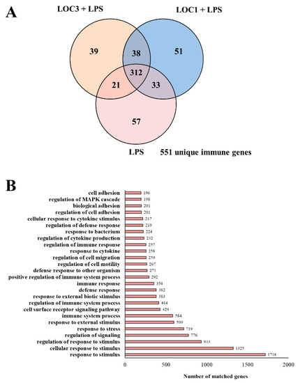 Effect of Lactiplantibacillus plantarum strains isolated from fresh tea leaves in murine RAW macrophages stimulated with the Toll-like receptor 4 (TLR4) agonist lipopolysaccharide (LPS). Macrophages were treated with L. plantarum LOC1 or LOC3 strains and then challenged with LPS. The expression of genes was determined by microarray analysis 3 h after LPS stimulation. Non-lactobacilli-treated macrophages stimulated with LPS were used as control. Venn diagrams showing the number of differentially regulated immune (A) genes for each experimental group. Number of matched genes categorized according to the Gene Ontology (GO) database (B).