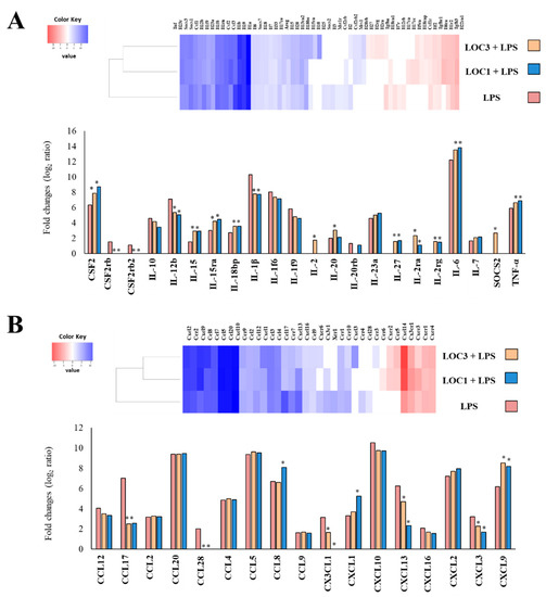 Effect of Lactiplantibacillus plantarum strains isolated from fresh tea leaves in murine RAW macrophages stimulated with the Toll-like receptor 4 (TLR4) agonist lipopolysaccharide (LPS). Macrophages were treated with L. plantarum LOC1 or LOC3 strains and then challenged with LPS. The expression of genes was determined by microarray analysis 3 h after LPS stimulation. Non-lactobacilli-treated macrophages stimulated with LPS were used as control. Heat-map analysis and fold expression changes of cytokines (A) and chemokines (B). Asterisks indicate significant differences between the indicated groups and LPS-challenged control macrophages, (*) p < 0.05.