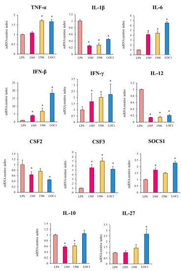 In order to confirm the changes induced by L. plantarum LOC1 in the immunotranscriptome response of LPS-challenged macrophages, qPCR was performed on selected genes. Genes with significant differences between LOC1-treated and non-treated macrophages were chosen. The expression of IL-10 was also evaluated. In addition, the influence of the well-characterized immunobiotic strains L. rhamnosus CRL1505 [22] and L. plantarum CRL1506 [23] on the response of macrophages to TLR4 activation was also studied for comparisons. As shown in Figure 4, the transcriptional changes evaluated by qPCR indicated a similar overall trend in the transcription of microarray. The treatment of macrophages with L. plantarum LOC1 significantly increased their expression levels of TNF-α, IL-6, IFN-β, IFN-γ, and CSF3 in response to LPS challenge. The LOC1 strain also reduced the expression of IL-1β, IL-12, and CSF2 in macrophages stimulated with the TLR4 agonist. Similarly, the treatment of macrophages with the CRL1505 and CRL1506 strains significantly augmented the expressions of IL-6, IFN-β, IFN-γ, and CSF3 and reduced IL-1β and IL-12 (Figure 4). No significant reductions were observed for TNF-α and CSF2 in macrophages treated with L. rhamnosus CRL1505 and L. plantarum CRL1506, respectively. Of note, L. plantarum LOC1 was more efficient than CRL1505 and CRL1506 strains to increase the expression of IFN-β (Figure 4). As expected, the LOC1 strain did not induce changes in IL-10 expression, while both CRL1505 and CRL1506 significantly reduced the expression levels of the regulatory cytokine. In addition, L. rhamnosus CRL1505 and L. plantarum LOC1 enhanced the expression of SOCS1, while only the LOC1 strain up-regulated IL-27 when compared to LPS-challenged macrophages (Figure 4).