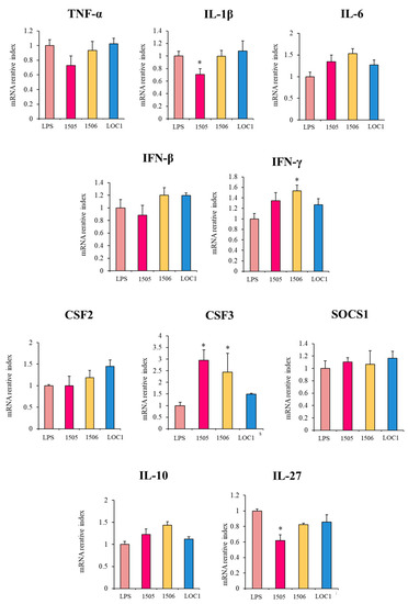 It was demonstrated that intestinal epithelial cells play a crucial role in the interaction of the intestinal immune system with microbes. Epithelial cells influence immune responses by orchestrating communication between intestinal microbes and mucosal innate immune cells such as macrophages [24]. Thus, we aimed to evaluate whether L. plantarum LOC1, L. rhamnosus CRL1505 or L. plantarum CRL1506 were able to influence the response of macrophages to LPS challenge indirectly through intestinal epithelial cells. For this purpose, murine intestinal epitheliocytes (MIE cells) co-cultures with RAW macrophages were prepared. MIE cells were stimulated with LOC1, CRL1505 or CRL1506 strains and then macrophages were challenged with the TLR4 agonist, and the expressions of immune factors were evaluated by qPCR (Figure 6). No significant differences were observed between control and lactobacilli-treated cells when the expressions of TNF-α, IL-6, IFN-β, CSF2, SOCS1 and IL-10 were evaluated. The treatment with L. rhamnosus CRL1505 reduced the expression of IL-1β and IL-27, while the CRL1506 improved IFN-γ (Figure 6). Both, L. rhamnosus CRL1505 and L. plantarum CRL1506 significantly increased the expression levels of CSF3. Of note, the treatment with L. plantarum LOC1 did not induce changes in TNF-α, IL-6, IFN-β, CSF2, CSF3, SOCS1 or IL-10 (Figure 6).