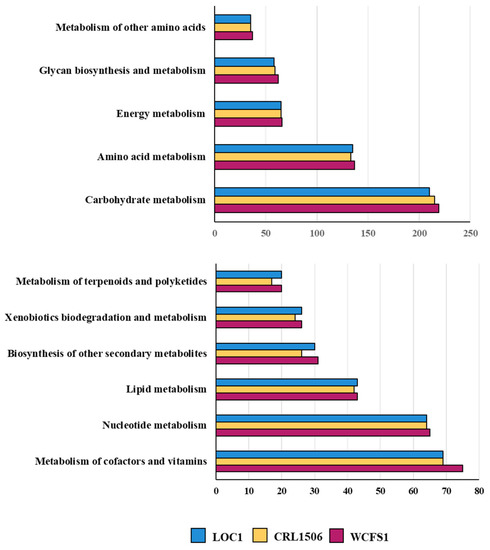 The KEGG database and the BlastKOALA tool were used for the functional characterization of the LOC1 strain genome (Figure 7). L. plantarum CRL1506 and the well-characterized probiotic strain WCFS1 were used for comparisons. No differences were observed in the number of metabolism pathway genes associated with carbohydrates (213 ± 2), glycan biosynthesis and metabolism (59 ± 1), amino acids (135 ± 2), lipids (41 ± 2), nucleotides (65 ± 2) or energy metabolism (65 ± 2) among the strains. In addition, no significant differences were found in cofactors and vitamins (69 ± 3), polyketides (18 ± 3) or biosynthesis of other secondary metabolites (27 ± 3) when the genomes of LOC1, CRL1506 and WCFS1 were compared (Figure 7). There were also no differences in the numbers of genes associated with “genetic information processing”, “environmental information processing” or “cellular processes” between the three lactobacilli strains (Figure S2).