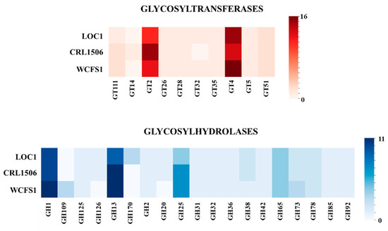 Analysis of the number of genes of the different families of glycosyltransferases (GT) and glycosylhydrolases (GH) in Lactiplantibacillus plantarum LOC1. The genome of the LOC1 strain was studied and compared with the probiotic strains WCFS1 and CRL1506 as reference.
