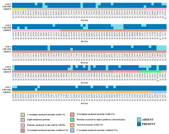 Analysis of the presence/absence of extracellular proteins in Lactiplantibacillus plantarum LOC1. The genomes of LOC1 and CRL1506 strains were studied and compared with the probiotic strain WCFS1 as reference (lp_ genes). Proteins were grouped in C-terminal anchored proteins with and without cleavage sites (CS), N-terminal anchored proteins with and without CS, lipid-anchored proteins, proteins anchored to the wall by the LPxTG domain, secreted proteins with CS and proteins secreted by minor pathways.