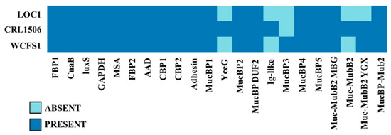 We also investigated the presence of genes involved in the adhesion to the gastrointestinal tract in the genome of L. plantarum LOC1. For this purpose, a bioinformatic analysis was carried out considering different types of molecules with mucus/mucin-binding domains, which were recently characterized and described in a comparative genomic study using strains of L. plantarum possessing differential immunomodulatory activities [28]. Then, the proteins MucBP1, MucBP2, MucBP3, MucBP4, MucBP5, MucBP-DUF1, MucBP-DUF2, Muc-MubB2-MBG, Muc-MubB2-YGX, Muc-MubB2, YceG and Ig-like were searched in the genome of the LOC1 strain (Figure 10). Similar to the WCSF1 strain, L. plantarum LOC1 does not possess the proteins YceG, Ig-like, and Muc-MubB2. The proteins MucBP3 and Muc-MubB2-YGX were also absent in the genome of the LOC1 strain.