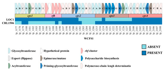 Analysis of the presence/absence of genes involved in the biosynthesis of exopolysaccharides (EPS) in Lactiplantibacillus plantarum LOC1. The genomes of LOC1 and CRL1506 strains were studied and compared with the probiotic strain WCFS1 as reference (lp_ genes). Four clusters for EPS biosynthesis (cps1, cps2, cps3 and cps4) and the rfb cluster involved in the incorporation of rhamnose to EPS are shown.