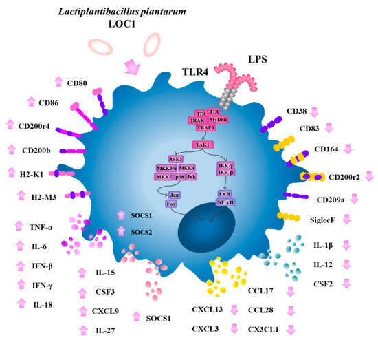 Schematic representation of the immune factor expressions differentially by Lactiplantibacillus plantarum LOC1 in murine RAW macrophages stimulated with the Toll-like receptor 4 (TLR4) agonist lipopolysaccharide (LPS). Up- and down-regulation of immune genes with respect to LPS-treated control macrophages are shown with arrows.