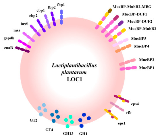 Schematic representation of glycosylhydrolases (GH), glycosyltransferases (GT), adhesion factors and exopolysaccharide (EPS) detected in the Lactiplantibacillus plantarum LOC1 genome. The genome of the LOC1 strain was studied and compared with the probiotic strains WCFS1 and CRL1506 as reference.