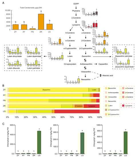 Quantification of carotenoids and chlorophylls in the fruits of five sea buckthorn varieties: (A) the carotenoid levels in the fruits of five sea buckthorn varieties; (B) the proportions of each colored carotenoid of the total colored carotenoids in the fruits of five sea buckthorn varieties; (C) the levels of chlorophylls a and b and the total chlorophylls in the fruits of five sea buckthorn varieties. Each bar represents the average of three biological replicates plus the standard deviation. Significant difference between the data were evaluated via a one-way ANOVA and labeled with different letters (p < 0.05).