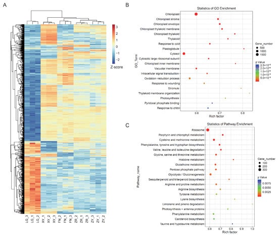 To investigate the molecular basis of the color formation in sea buckthorn fruit, RNA-Seq was performed in the five varieties of ripe fruit. After removing adapter and low-quality sequences, 38,792,620–54,610,674 clean reads for each sample were mapped to the H. rhamnoides subsp. mongolica reference genome, with read mapping rates in the range of 70.05–93.97% (Table S3). The Pearson’s correlation analysis showed that the global transcriptome signatures of biological replicates in each group were highly correlated, with the Pearson’s correlation coefficients ranging between 0.909 and 0.979. The overall distribution of the gene expression levels for each sample was analyzed, which was stable between the five varieties (Figure S1). The correlation dendrogram shows that ZR, XY, FN, and ZY are clustered, whereas LG seemed to be an outlier, which indicated that the global gene expression patterns of ZR, XY, FN, and ZY were similar and different from that of LG (Figure 3A).