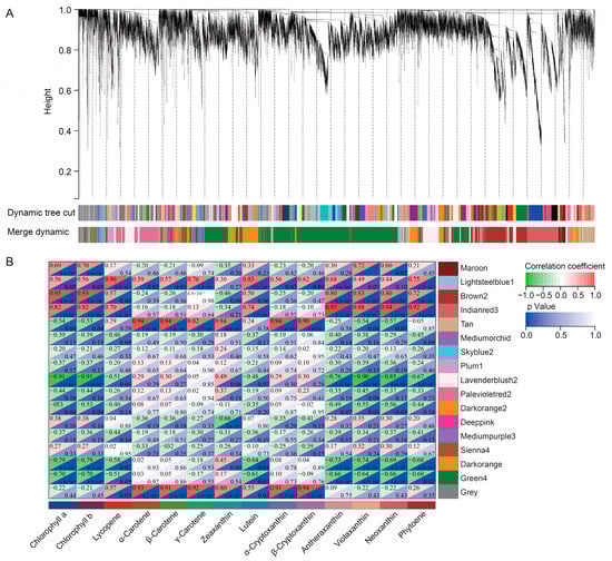 A weighted gene co-expression network analysis of DEGs in ripe fruits of five sea buckthorn varieties: (A) cluster dendrogram showing the gene co-expression modules from the WGCNA analysis; (B) module–chlorophyll and module–carotenoid relationships. Each row represents a module. Each column represents a specific chlorophyll or carotenoid. The value in each cell represents the correlation coefficient between the module and the chlorophyll or carotenoid, as well as the p value.