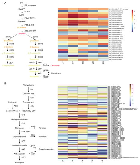 Carotenoid and flavonoid metabolism pathways and synthesis genes. (A) Carotenoid metabolism pathways and synthesis genes. IPP, isopentenyl diphosphate; DMAPP, dimethylallyl pyrophosphate; GGPP, geranylgeranyl diphosphate; GGPS, GGPP synthase; PSY, phytoene synthase; PDS, phytoene desaturase; Z-ISO, ζ-carotene isomerase; ZDS, ζ-carotene desaturase; CRTISO, carotenoid isomerase; LCYE, lycopene ε-cyclase; LCYB, lycopene β-cyclase; CHYB, β-carotene hydroxylase; LUT5, Lutein deficient 5; ZEP, zeaxanthin epoxidase; VDE, violaxanthin de-epoxidase; CCS, capsanthin–capsorubin synthase; NXS, neoxanthin synthase; NCED, 9-cis-epoxycarotenoid dioxygenase. (B) Flavonoid metabolism pathways and synthesis genes. PAL, phenylalanine ammonia lyase; C4H, cinnamate 4-hydroxylase; 4CL, 4-coumarate-CoA ligase; ACC1, acetyl-CoA carboxylase 1; CHS, chalcone synthase; CHI, chalcone isomerase; F3H, flavanone 3-hydroxylase; F3′H, flavonoid 3′-hydroxylase; DFR, dihydroflavonol 4-reductase; ANS, anthocyanidin synthase; UFGT, flavonoid-3-O-glucosyltransferase; FNS, flavone synthase; FLS, flavonol synthase; LAR, leucoanthocyanidin reductase; ANR, anthocyanidin reductase. The pathway is constructed based on KEGG pathway and references. Heat maps of gene expression levels based on FPKM values.