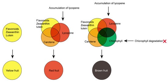 It is known that in the CMY color system, the different ratios of three colors, including cyan, magenta, and yellow, can produce all other colors [43]. In the CMY color system, the yellow was 0% cyan, 0% magenta, and 100% yellow; the orange was 0% cyan, 50% magenta, and 100% yellow; the red was 0% cyan, 100% magenta, and 100% yellow; the green was 100% cyan, 0% magenta, and 100% yellow; the black was 100% cyan, 100% magenta, and 100% yellow. The different proportions of yellow and red pigments could produce yellow, orange, and red colors. According to the CMY color system, in the yellow fruit ZY, the high ratio of yellow pigments and few red and orange pigments formed the yellow fruit color phenotype. In the orange fruits XY and FN, large amounts of yellow pigment and small amounts of orange and red pigments were mixed to produce the orange fruit colors. In the red fruit ZR, a large amount of yellow pigment and large amounts of orange and red pigments were mixed to produce the red fruit color (Figure 7). It is worth noting that the mixing of different ratios of red and green pigments produce different colors, including brown, deep green, reddish brown, and black. In the brown fruit LG, large amounts of orange and red pigments and a large amount of green pigment were mixed to produce the brown fruit color (Figure 7).