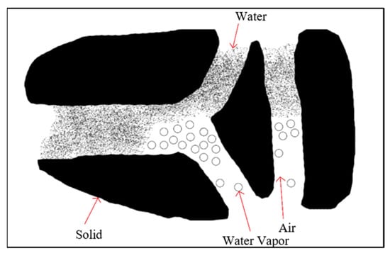 where Dw,cap is the capillary diffusion rate (m3·s−1), , kin is the intrinsic permeability (m2), and kr is the relative permeability. The gas flux (), including air and water vapor, can be obtained by Darcy’s law []: