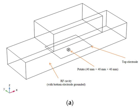 There modules including “electric current (AC/DC)”, “heat transfer in the solid”, and “dilute phase flow” were selected and coupled with the parameter of water content and temperature in COMSOL Multiphysics® (COMSOL Multiphysics 5.2, COMSOL Inc., Burlington, MA, USA). The scheme of the RF heater is described in Figure 2. A potato cube (40 40 40 mm) was placed at the center of the bottom electrode, with an electrode gap between the top and bottom electrode of 100 mm. After geometry creation, the material properties and appropriate initial/boundary conditions were set up for all domains according to experimental conditions, which was discussed in Section 2.1.7. Tetrahedral mesh was applied to all domains. The mesh size was selected as “extremely fine” for the potato sample, and the maximum size of the mesh was set as 0.00242 m. The determination of mesh size was based on the comprehensive consideration of mesh convergence criteria and saving computing resources. That is, the maximum temperature difference between the temperature–time curves of the sample before and after continuous refinement of the mesh was less than 1%. The mesh size before refinement was selected considering the computational resources and the accuracy of calculation. The total meshes include 152,638 domain elements, 7699 boundary elements, and 495 edge elements. The Multifrontal Massively Parallel Solver (MUMPS) was selected with the time step set as 0.001 s, and the backward difference iteration method was adopted for solving the model. The temperature field, the moisture content distribution, the water vapor concentration, and the temperature–time history of the sample center were obtained, and the changes of each value in the drying process were compared, respectively. The simulation process was performed on a Dell workstation with two dual-core Intel Xeon CPU 2.60 GHz processors and 128 GB RAM with the Microsoft Windows Server (Microsoft Corporation, Redmond, WA, USA) 2012 R2 standard operating system installed. The total computing time was 572 min.
