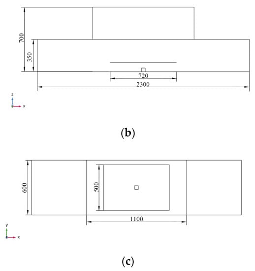 Geometric model of RF drying heater and placement of potato: (a) layout, (b) front view, and (c) top view (all dimensions are in mm).