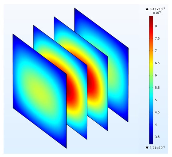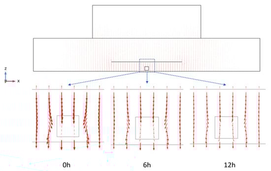 The visualized electromagnetic field distribution within the potato sample is plotted at the time of 0, 6, and 12 h for comparison in Figure 3. A certain angle of deflection of the electric field was observed at the edges, especially the corners of the potato cube sample, throughout the drying process, which is usually the main cause of edge heating. This was possibly attributed to the sample size being smaller than the top electrode, and the electric field was deflected at the edges at the surface of potato sample []. The deflection angle was reducing as the drying process continued, which indicated that the RF drying process led to faster water evaporation at the corners and enhanced the electric field intensity at the edges.