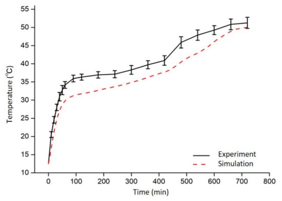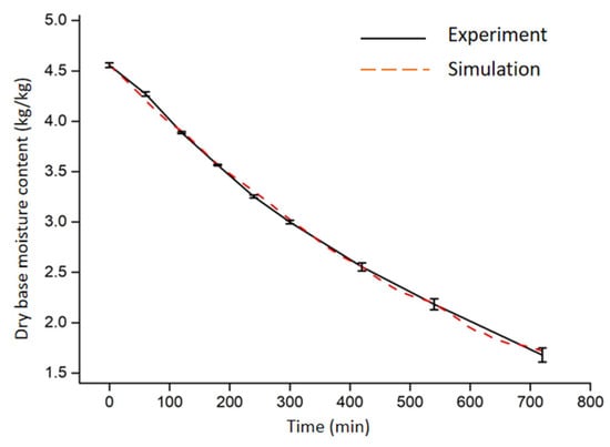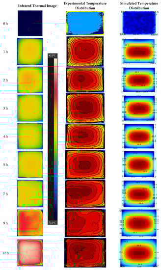 Figure 4 shows the temperature distribution at the potato cube surfaces from both computer simulation and experiment during RF drying. Results showed a similar distribution pattern between simulation and experiment results. The center temperature increased faster than that at the edges, which was possibly caused by a higher moisture content at the centers, with the electromagnetic field focused on this zone, and resulted in a higher temperature. This is the moisture auto-balancing advantage for RF drying since it prevents the sample from overheating []. Similar results were also reported by Wang et al. [] and Zhou et al. []. Within the 1st h of drying, a significant temperature increase at the sample surface was found, and the temperature difference between simulation and experiment was less than 2.6 °C. At this stage, results demonstrated that the simulated temperature distribution pattern matched the experimental one well. Within the 1~7 h of drying, the surface temperature increased by only ~2 °C. The energy absorption was not reflected in the temperature increase because of water evaporation []. In general, the experimental results were also in good agreement with the simulation results. However, the hot region started moving to the left boundary from the center, while the simulation result was still in the center of the sample surface as shown in 7 h temperature diagrams. This might be due to uneven water transfer in the actual drying process caused by uneven shape or accidental thermal-runaway phenomena. After 7 h treatment, sample temperature started to increase significantly again, and the drying process entered the falling rate period, which indicated insufficient water in the sample for continuous evaporation []. The hot spot area continued to move to the left boundary of the sample in this stage, while the simulation results were still in the central position. The discrepancy between simulation and experimental results was because the measurement errors of material properties were exaggerated during drying experiments.