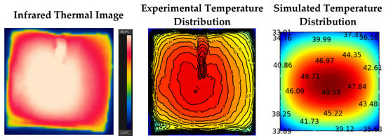 After the drying experiment, the potato sample was quickly cut into halves with a thin blade, and the temperature profile of the cross-sectional surface was captured with an infrared thermal imager. Figure 5 compares the temperature distribution on the sample cross-sectional surface between the experimental and the simulated results. The internal temperature of the sample was reduced to a certain extent due to cutting. The temperature drop was ~3.2 °C from the comparison of fiber optic sensor reading (51.2 °C) and the infrared camera capture at the center point (48.0 °C). An interesting phenomenon was observed: the temperature at the center of the sample where the fiber sensor was inserted was higher than that of the other areas of the sample, as shown in Figure 5. The possible reason is that there was a little gap between the fiber optic sensor and the potato sample during insertion, resulting in a localized heating phenomena.